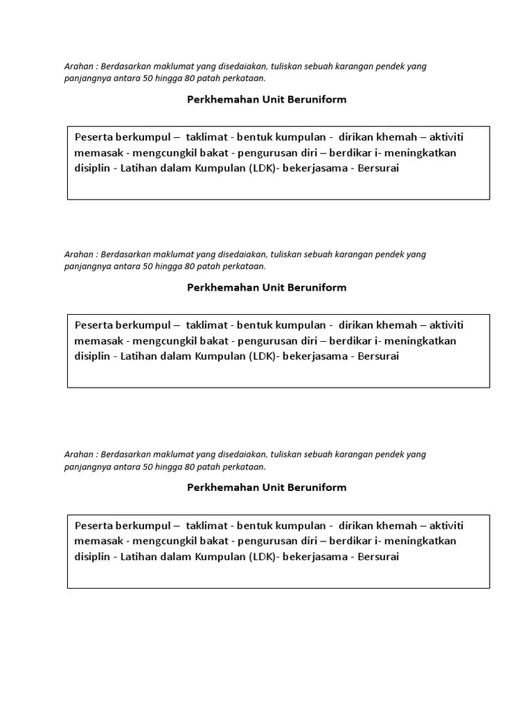 Aktiviti Perkhemahan Unit Beruniform Karangan Pendek / 61749401 Asas Perkhemahan. Kami akan menulis karangan dalam bahasa melayu dan bahasa english di blog ini. Perkhemahan adalah satu aktiviti wajib yang dilakukan setiap tahun oleh setiap sekolah (kem unit beruniform) dan diteruskan ke peringkat . Selain mencungkil bakat peserta dalam pelbagai aktiviti, Perkhemahan pengakap di sekolah saya. Banyak yang aku pelajari semasa . Baca versi flipbook dari karangan pendek.